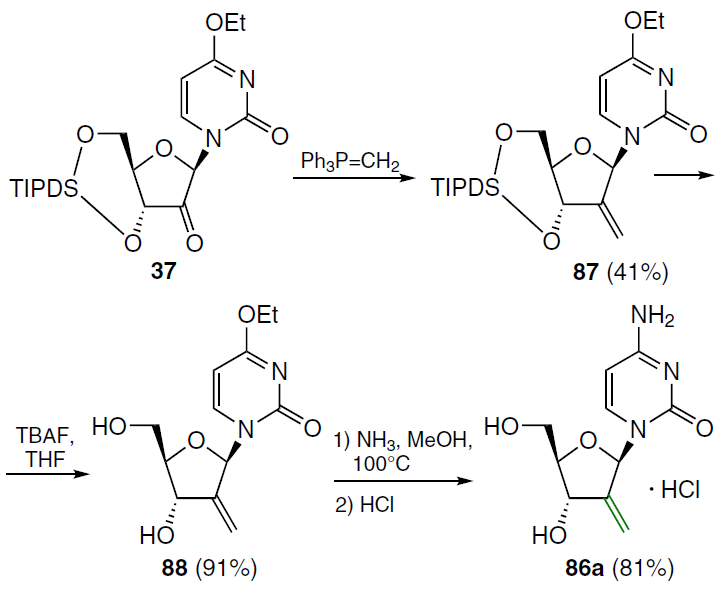 When a double bond is introduced into the 2' position of 2'-deoxycytidine, it forms, together with the secondary 3'-hydroxyl group, an allyl alcohol system, which is also found in a number of nucleoside antibiotics, including angustmycin A and neplanocin A. This structural feature may play an important role in the manifestation of biological activity due to increased reactivity and/or conformational fixation of the carbohydrate moiety. To test this hypothesis, 2'-deoxy-2'-methylidenecytidine (DMDC, 86a) was synthesized.[72] The starting 2'-ketonucleoside 37 was treated with an excess of methylenetriphenylphosphorane, previously obtained by the reaction of potassium hydride with methyltriphenylphosphonium bromide in dimethyl sulfoxide (Scheme 15). This resulted in the formation of 2'-methylidene nucleoside 87, desilylation of which by TBAF in THF afforded derivative 88 in high yield. Compound 88 was then converted by ammonolysis to the target nucleoside 86a, which was isolated as the hydrochloride.[72]