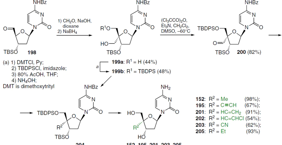 Scheme 38 shows the synthetic route to 4'-substituted 2'-deoxycytidines. Aldehyde 198 was the starting compound, which was treated with an aqueous solution of formaldehyde and NaOH in dioxane for 10 min at room temperature. Subsequent reduction of the aldehyde function at position 4' with NaBH4 afforded compound 199a. Intermediate compound 199, obtained by manipulation with the protecting groups, was oxidized to the corresponding 4'-C-aldehyde 200 under the Swern reaction conditions.[137] Intermediate 200 was isolated as crystals and used for the synthesis of the target nucleosides 152, 195, 201 – 205.138