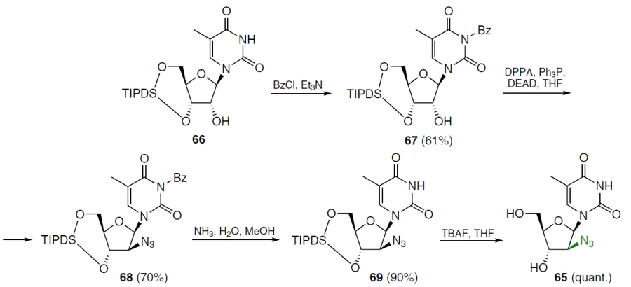 In the first step of the synthesis of 1-(2'-azido-2'-deoxy-β-D-arabinofuranosyl)thymine (65), N3-benzoyl derivative 67 was obtained from 1-[3',5'-O-(tetraisopropyldisiloxane-1,3-diyl)-β-D-ribofuranosyl]thymine (66) by treatment with benzoyl chloride in the presence of triethylamine in dichloromethane (Scheme 11).[66] Nucleoside 67 was treated with diphenyl phosphorazidate, triphenylphosphine, and diethyl azodicarboxylate in THF at room temperature to afford intermediate 68, which was purified by silica gel column chromatography in 70% isolated yield. Debenzoylation of compound 68 was achieved with a methanolic NH3 solution, and the reaction mixture was then treated with a THF solution of TBAF, affording the target product 65 in quantitative yield over two steps.[66]