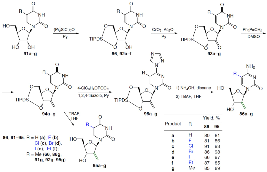 2'-Deoxy-2'-methylidenecytidine 86a and its analogues 86b – g (see Scheme 17) were synthesized from 2'-methylidene derivatives of uridine 94a – g. The latter were reacted with 4-chlorophenyl phosphorodichloridate and 1,2,4-triazole in pyridine, and then the resulting 4-triazolyl derivatives 96a – g were treated with NH4OH followed by deprotection with TBAF in THF to afford the target products 86a – g in high yields.