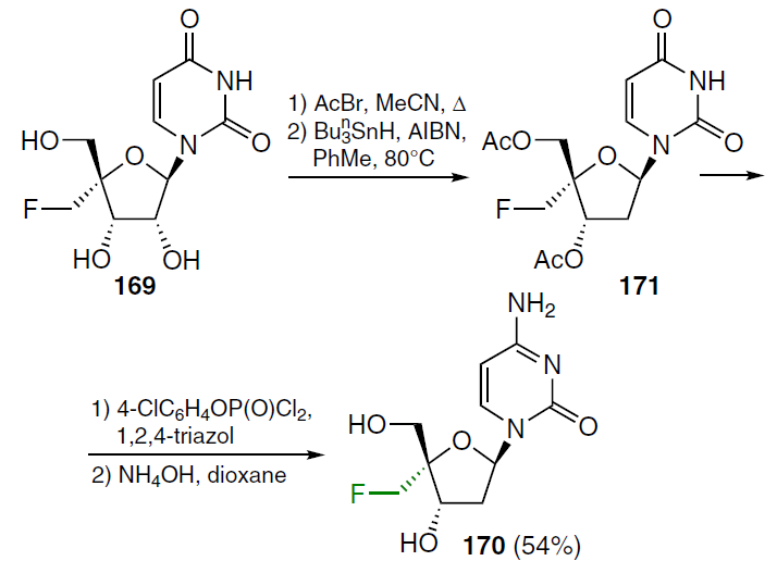 The first step in the synthesis of 2'-deoxy-4'-fluoromethylcytidine (170), shown in Scheme 32, involved treating ribonucleoside 169 with acetyl bromide in boiling acetonitrile and subsequent heating in the presence of tributylstannane and AIBN in toluene at 80°C to afford 2'-deoxy-3',5'-di-O-acetyl-4'-fluoromethyluridine (171). Compound 171 was treated sequentially with 4-chlorophenyl phosphorodichloridate, then with 1,2,4-triazole and NH4OH in dioxane. This gave 2'-deoxy-4'-fluoromethylcytidine (170) in 54% yield.[133]