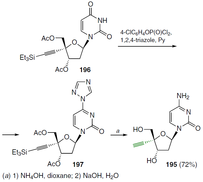 2'-Deoxy-4'-C-ethynylcytidine (195) was synthesized from 3',5'-di-O-acetyl-4'-C-triethylsilylethynyl-2'-deoxyuridine (196) (Scheme 37).[136] Starting compound 196 was treated with 4-chlorophenyl phosphorodichloridate and 1,2,4-triazole in pyridine, which delivered the 4-triazole derivative 197. Further steps of reaction with NH4OH in dioxane and alkaline hydrolysis gave rise to the target 2'-deoxy-4'-C-ethynylcytidine (195) in moderate yield.