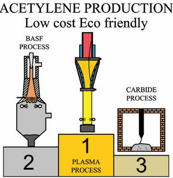 Yao et al.[14] compared the oxidative pyrolysis (BASF process), hydrocarbon decomposition in a plasma arc (Huels process), and the plasma-chemical process they developed in which the key device is a high-frequency pulsed plasma generator (HFPP process). The study showed that HFPP process has lower operating costs and requires less capital investment. Furthermore, this method provides higher purity of produced acetylene and has high efficiency: the production of 1 ton of acetylene requires 4 to 5 tons of methane, which is comparable with the level of methane utilization in oxidative pyrolysis. The calculation also included methane that is burnt to generate the electrical energy required for operation of the plasma torch. When the plasma-chemical unit is integrated with generators powered by renewable energy sources, the efficiency of the process further increases.