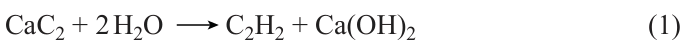 The step of calcium carbide reaction with water can be conducted in two ways, that is, using wet and dry procedures. These methods differ in the ratio of water to calcium carbide in the reaction mixture. In the wet method, the molar ratio of water to calcium carbide approaches 6 : 1, which implies the use of 7 to 9 tons of water per ton of calcium carbide. In the case of dry process, the ratio of water to calcium carbide is close to the stoichiometric ratio. A small excess amount of water is almost completely evaporated during the vigorous exothermic reaction of CaC2 with water (without cooling, the temperature of the reaction mixture can be as high as 973 K). This reaction gives a by-product, calcium hydroxide, which is removed from the reaction furnace as a powder. As opposed to this, the wet reaction procedure gives a suspension of calcium hydroxide, which needs to be concentrated and separated. Nevertheless, the wet method is preferable in terms of efficiency of the control of the process temperature. Upon annealing, calcium hydroxide is again converted to calcium oxide, which implies the possibility of its reuse. However, the proportion of reuse usually does not exceed 60% due to the presence of the above-mentioned sulfur and phosphorus impurities, the accumulation of which leads to their transfer into the target product as phosphine and hydrogen sulfide.
