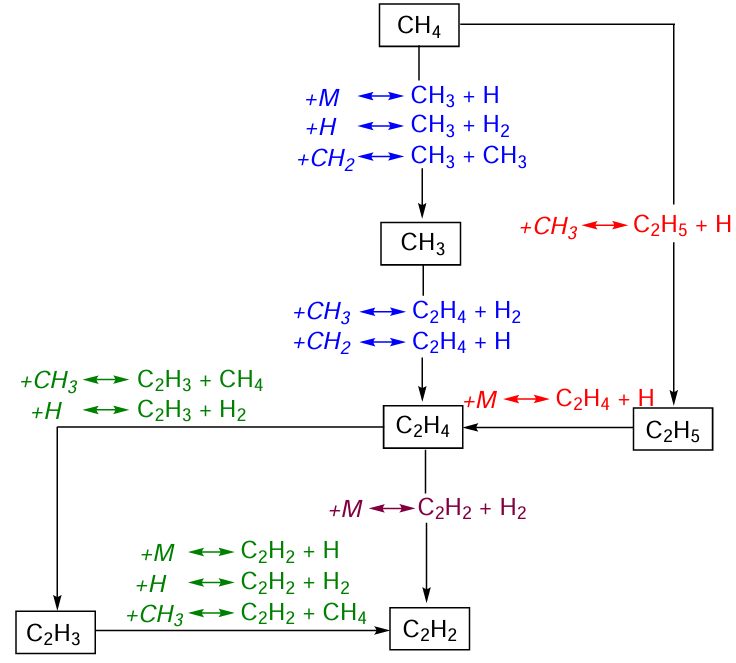 It is known that back in the 1940s, there were operating plants around the world in which acetylene was produced from light hydrocarbons in electric discharge plasma.[95] This process involved direct plasma-thermal conversion of methane into acetylene or electrocracking of methane. The authors believed[95] that particularly the methyl radical plays the key role in the formation of acetylene. The predominant reaction pathways based on calculated rates are shown in Scheme 5.