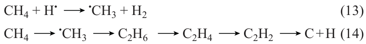 Nevertheless, the contribution of high-energy electrons to methane activation remains low. Slovetskii[105] demonstrated that the methane conversion in a non-equilibrium plasma does not exceed 18%. Inada et al.[124] found that the ratio of high-energy electrons to gas molecules varies in the range from 10–3 to 10–8. Dors et al.[125] established that methane conversion does not take place directly in the plasma medium, but occurs at the boundary of the region in which the reaction mixture is partially mixed with the plasma-forming gas. Thus, methane decomposition in plasma is predominantly a thermal process. As proposed by Diamy et al.,[126] it is thermal plasma that initiates the formation of atomic carbon from methane; the atomic carbon then reacts with CH3• and CH2• radicals to give acetylene.