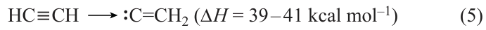 A somewhat different point of view on the mechanism of soot formation by the polyyne mechanism was reported by Slovetskii et al.[105][115] From the Slovetskii’s viewpoint, the formation of carbon from acetylene by the polyyne mechanism starts with the acetylene isomerization to vinylidene carbene (Equation (5)).