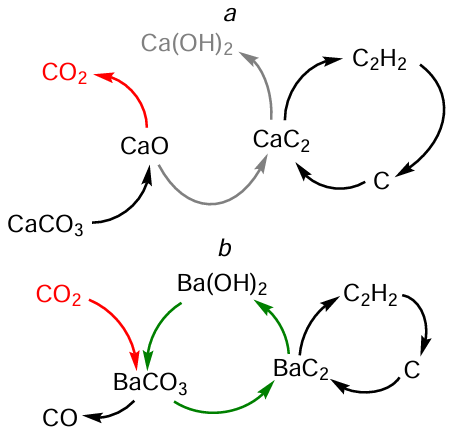 One method to increase the efficiency of acetylene synthesis is to replace calcium carbonate with barium carbonate. Upon annealing, barium carbonate is also converted to the oxide, but this occurs at a lower temperature (1600°С). This makes it possible to avoid the use of power-consuming electric arc furnaces at this stage.[47]