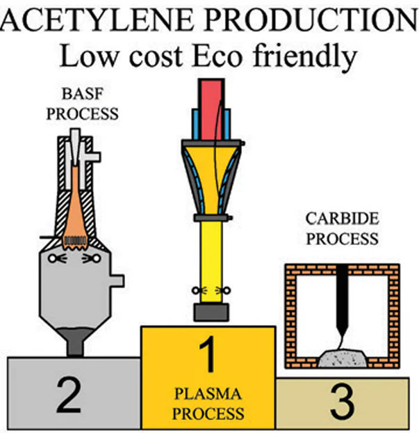 The plasma-chemical process and electrocracking are different, but, at the same time, similar methods of thermal decomposition of hydrocarbons. In the case of electrocracking, the plasma is formed exclusively by an electric arc, in which cracking of the initial hydrocarbons takes place. The plasma-chemical process is a broader concept that implies the use of various plasma sources: apart from the electric arc, plasma-forming gases blown through the arc are used. Hydrogen, argon, and other gases are suitable; they form so-called low-temperature plasma. Also, the concept of plasma chemistry encompasses high-temperature plasma (or microwave plasma), but it is not used to produce acetylene or other products by hydrocarbon pyrolysis.