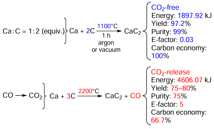 Academician Ananikov’s research group mentioned above also developed a revolutionary approach to the synthesis of calcium carbide giving no carbon dioxide. The CaC2 production process used currently generates considerable amounts of CO2. The key factor responsible for CO2 formation is the chemical reaction involved. When limestone ore reacts with coal, CO2 is inevitably formed and one carbon atom is thus lost. In this process, carbon monoxide is burnt to CO2 for maintaining the required high temperature of the synthesis (2473 K). The method proposed by Ananikov’s group implies the use of calcium metal instead of limestone in order to prevent CO2 emission, because the reaction of Ca with carbon is atom-economic, giving CaC2 as the only product at a much lower temperature (1373 K). The reaction of Ca with carbon was successfully tested for the synthesis of CaC2. The target product was isolated in 97.2% yield and 99% purity. The environmental friendliness of the proposed method was confirmed by calculation of the E-factor and by much lower reaction temperature. The cost of calcium in the process was rationalized.[69][70] As a result, it was shown that the use of calcium metal instead of limestone makes the calcium carbide production more efficient from both economic and environmental perspectives (Scheme 4).
