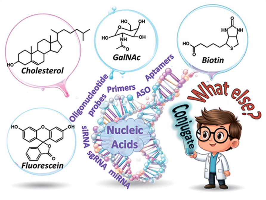 * In this review, the term ‘conjugate’ implies a molecular construct consisting of a nucleic acid (or oligonucleotide) moiety and a functional molecule (FM) (chemical compound with definite properties that allow the molecule to perform a specific role in chemical, biological, and physical properties), where the acronym FM may refer to either a whole molecule or a part of the molecule bound to oligonucleotide by a covalent bond either directly or through a linker group.