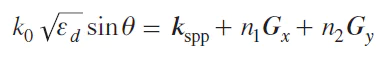 where ed is the dielectric constant of the medium from which light falls, Gx = ex2π/dx and Gy = ey2π/dy are the reverse lattice vectors parallel to the metal–dielectric interface, dx and dy are the lattice periods along the x and y axes, ex and ey are the basis vectors of the x and y axes, kspp is a surface plasmon polariton wave vector.