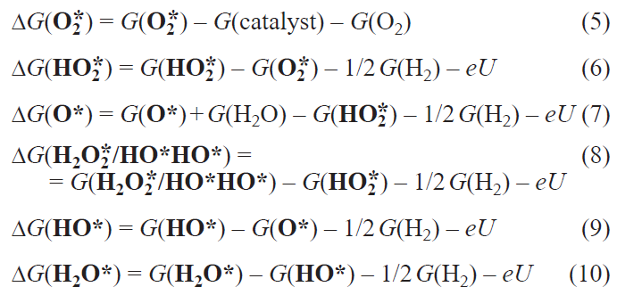 The change in free energy ΔG in each elementary step of the ORR catalytic cycle (see Fig. 2) for the first four terms of the Nørskov equation (1) can, in the general case, be calculated using equations (5) – (10).