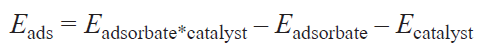 where Eads is the difference between the total electronic energies of a molecule adsorbed on the catalyst active site (asterisked), the adsorbate, and the catalyst (the negative or positive sign of Eads is indicative of exo- or endothermic adsorption), which can be calculated by equation (2)